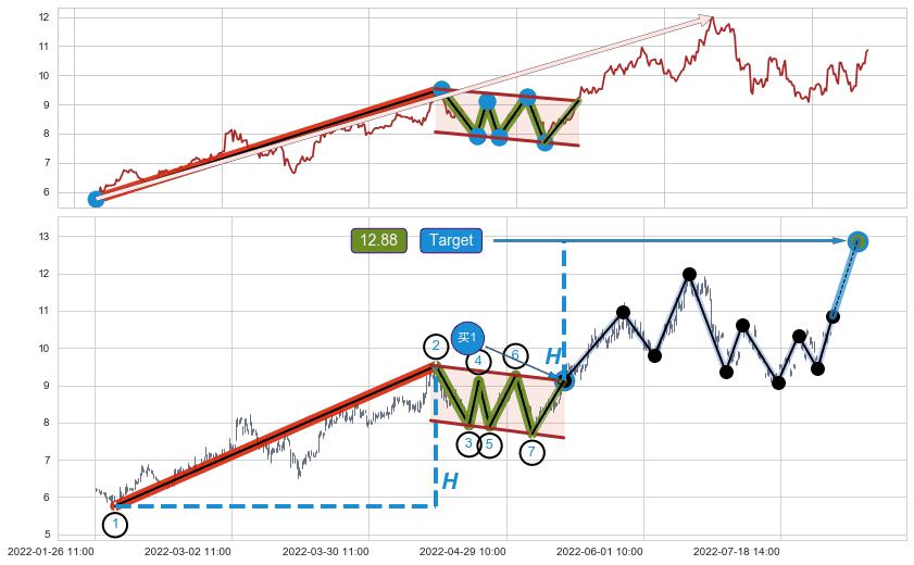 ➣ 降旗形:猜想预期上涨目标target即将达成,随后猜想强阻力来临,预期回调下跌(均值回复)