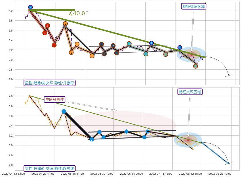 ♘ 在最后的下跌阶段2022-04-15 09:00至2022-08-11 14:00,存在 破位边缘的阻力位 ,阻力价格3.045,可信任强度74.87%,其距离最后价格3.060相差 -0.51%