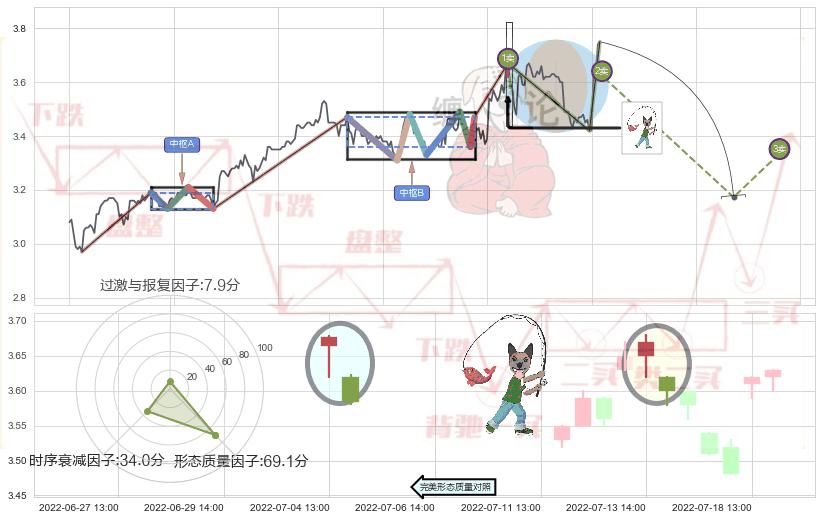 ➣ 【中枢B】:06-07:14-07-01:14,中枢由7笔构成,共62交易小时, ZG=3.470, ZD=3.360