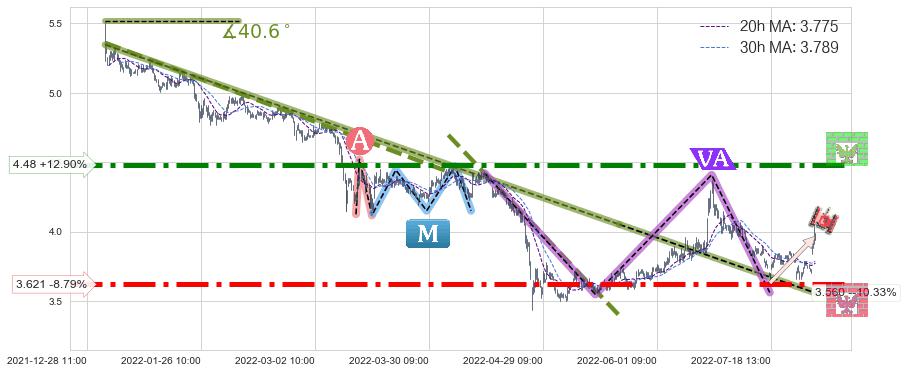 ♘ 阻力价格位4.48,可信任强度88.56%,距离最后交易2022-08-12 14:00形成的收盘价格3.970相差 +12.90%