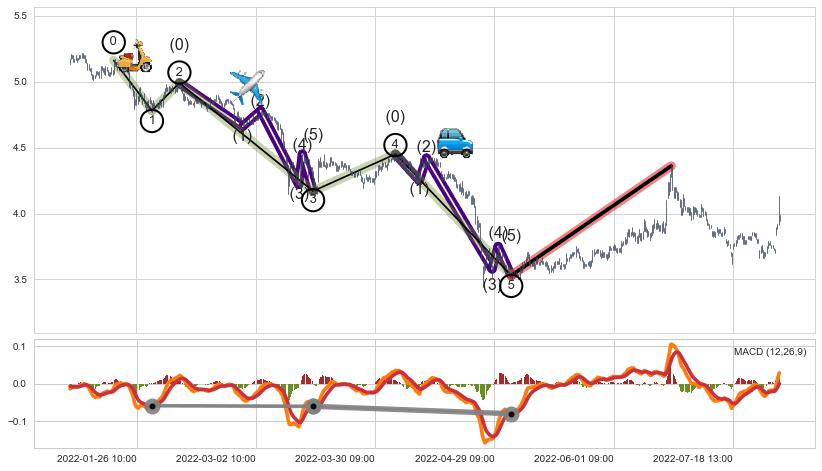 ➢ 趋势线:阻力位已击穿突破,猜想持续向上拉升上涨 → 上涨 →【突破】机会信号 → 大周期均值回复