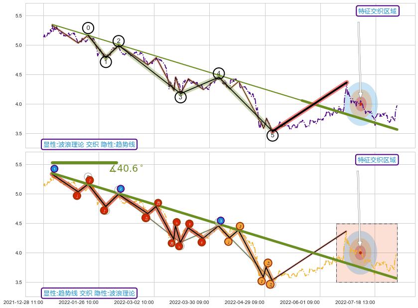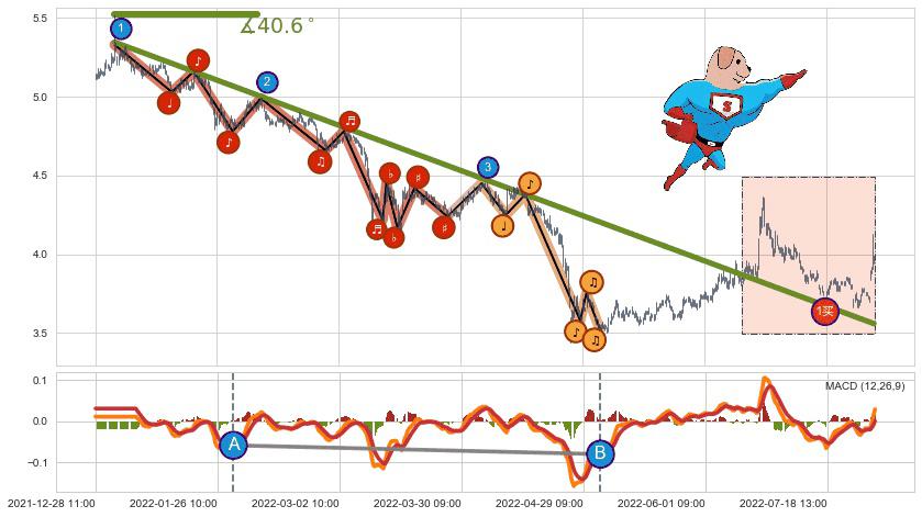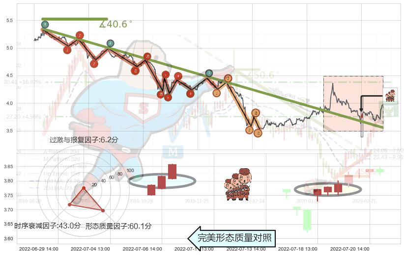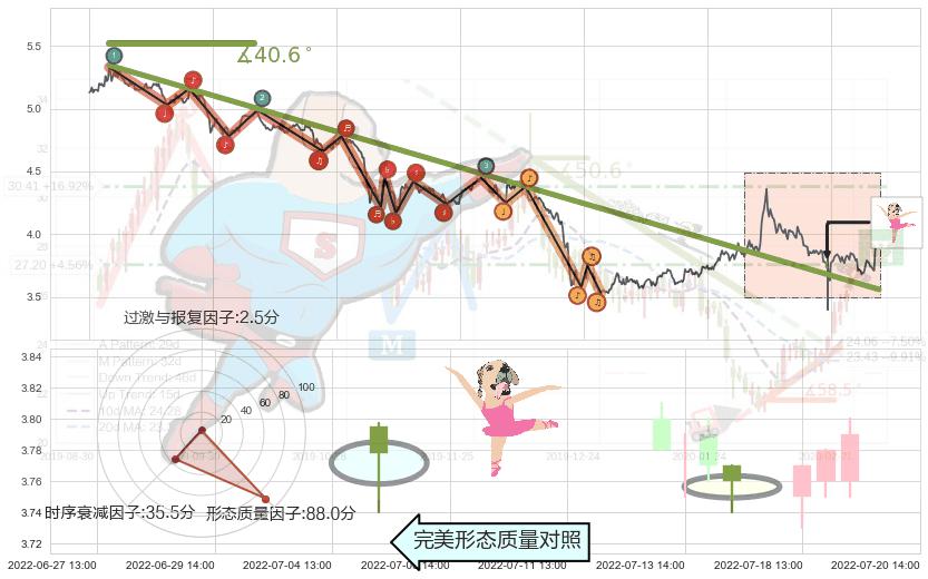 ➢ 2021-12-31 13:00-2022-05-23 11:00下跌趋势存在反转上涨[机会],其原下跌趋势的阻力位(3.560)已被突破[强支撑信号],原下跌趋势角度: 40.6˚