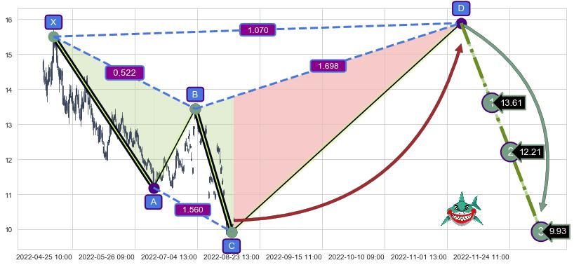 ➣ 谐波鲨鱼:b持续蓄力下跌击穿越过c:猜想报复性拉升 → 上涨 →【拐点】强支撑临近 → 大趋势均值回复