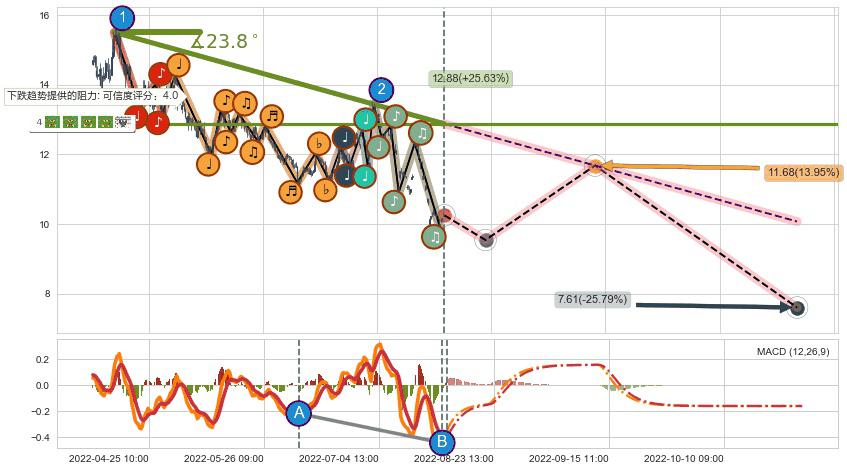 ♘ 在最后的下跌阶段2022-04-15 10:00至2022-08-12 14:00,存在 持续未破位的阻力位 ,阻力价格12.88,可信任强度83.73%,其距离最后价格10.25相差 +25.63%