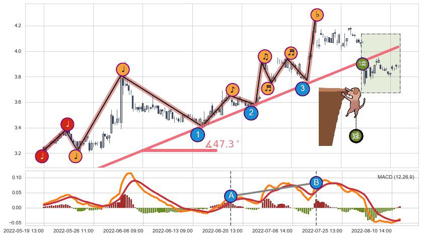 ➣ 2022-05-19 13:00-2022-07-21 13:00上升趋势存在反转[风险],其原上升趋势的支撑位(4.03)已破位[强阻力信号],原上升趋势角度: 47.3˚
