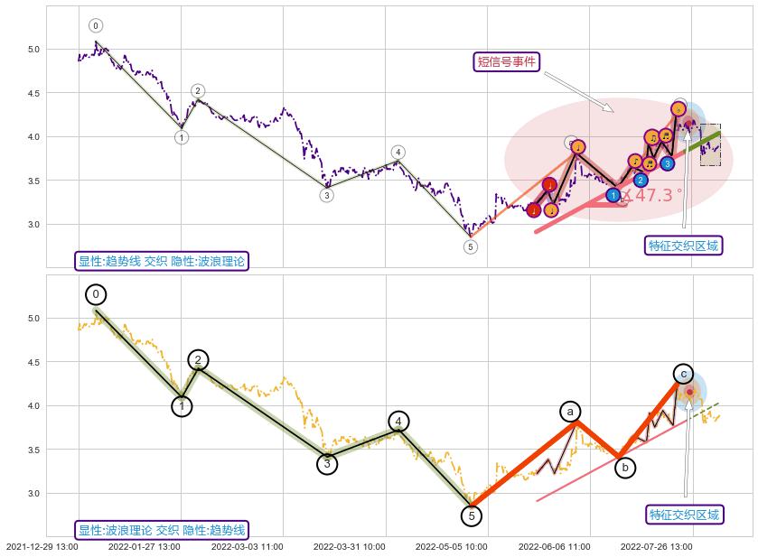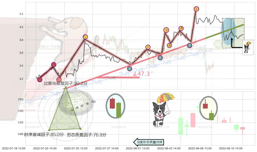 ➢ 2022-05-19 13:00-2022-07-21 13:00上升趋势存在反转[风险],其原上升趋势的支撑位(4.03)已破位[强阻力信号],原上升趋势角度: 47.3˚