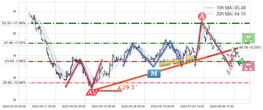 ♘ 阻力价格位47.86,可信任强度66.03%,距离最后交易2022-08-12 14:00形成的收盘价格44.53相差 +7.47%