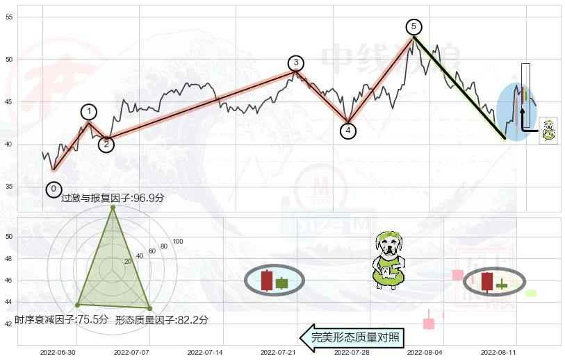 从2022-08-02 14:00至2022-08-12 14:00,共包含17个小时,阶段股价上涨9.71%,阶段股价变动位移路程比: 1 : 3,2022-08-05 13:00向⇪形成缺口,跳空上涨+8.37%