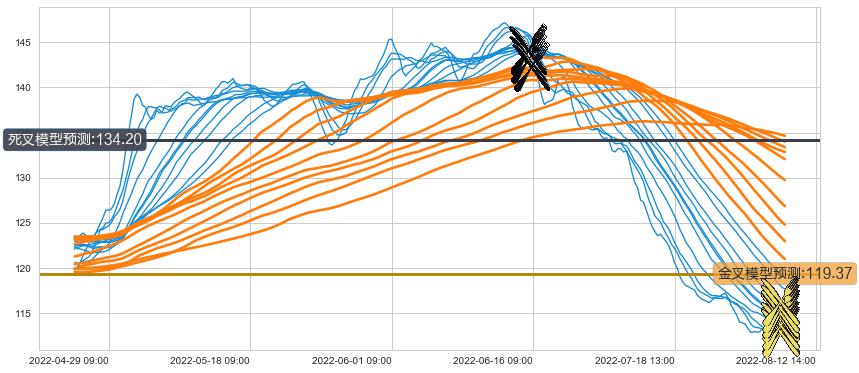 ➣ 80小时均线于(06-15 14:00: 142.20)形成【死叉】基于【死叉历史模型】预测死叉后最低波谷价格: 132.23, 死叉后最低价格111.69,已经下跌超出预测最低波谷价格, 预期反弹