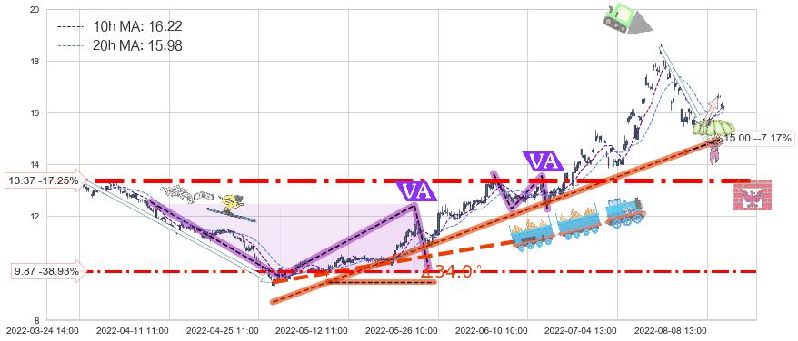 ♘ 在最后的上升阶段2022-04-27 09:00至2022-07-29 13:00存在 持续未破位的支撑位 ,支撑价格15.00,支撑可信任强度80.65%,其距离最后价格16.16相差 -7.17%