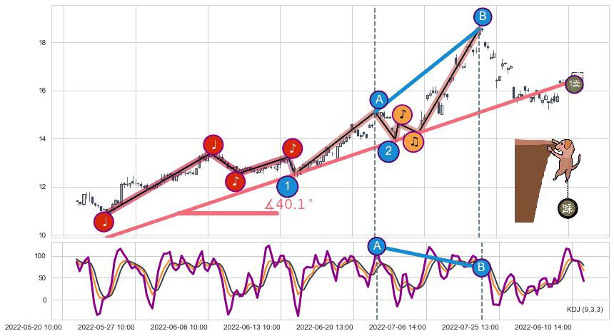 从2022-05-25 10:00至2022-07-22 14:00,共包含135个小时,阶段股价上涨49.98%,阶段股价变动位移路程比: 1 : 3,上涨趋势角度: 40.1