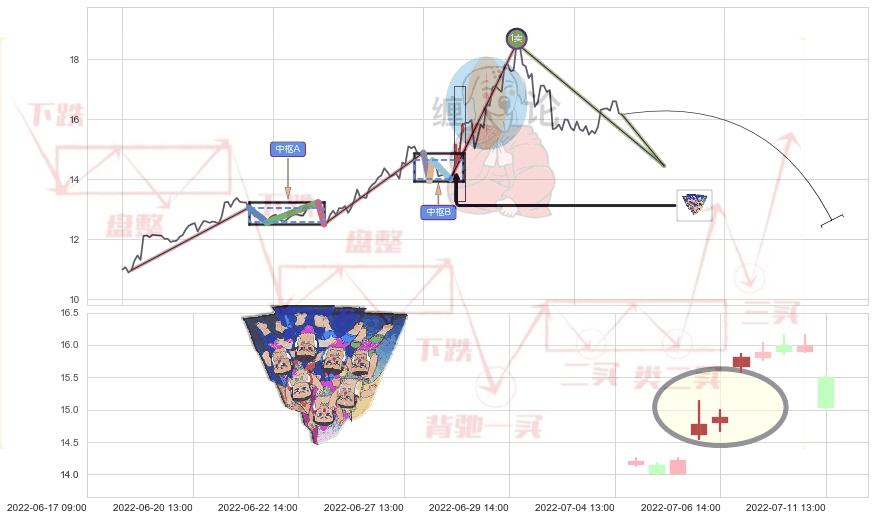 ➣ 【中枢B】:06-28:14-07-05:13,中枢由4笔构成,共10交易小时, ZG=14.63, ZD=14.01