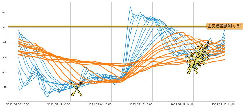 ➢ 40小时均线于(07-22 13:00: 5.18)形成【金叉】基于【金叉历史模型】预测金叉后最高波峰价格: 5.58, 金叉后最高价格5.68,已经上涨超出预测最高波峰价格, 预期回调