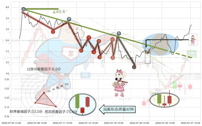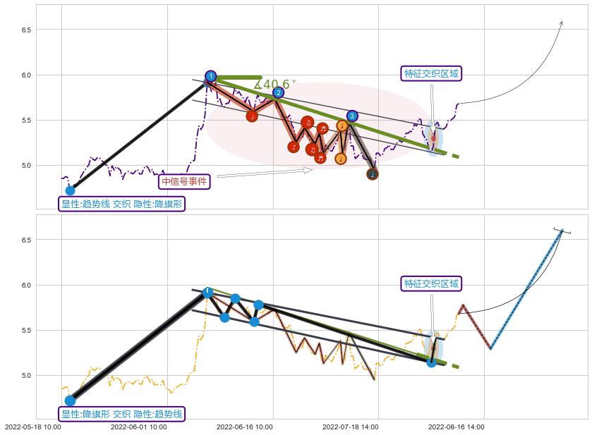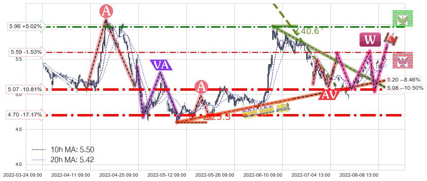 ➢ 2022-06-08 09:00-2022-07-29 14:00下跌趋势存在反转上涨[机会],其原下跌趋势的阻力位(5.08)已被突破[强支撑信号],原下跌趋势角度: 40.6˚