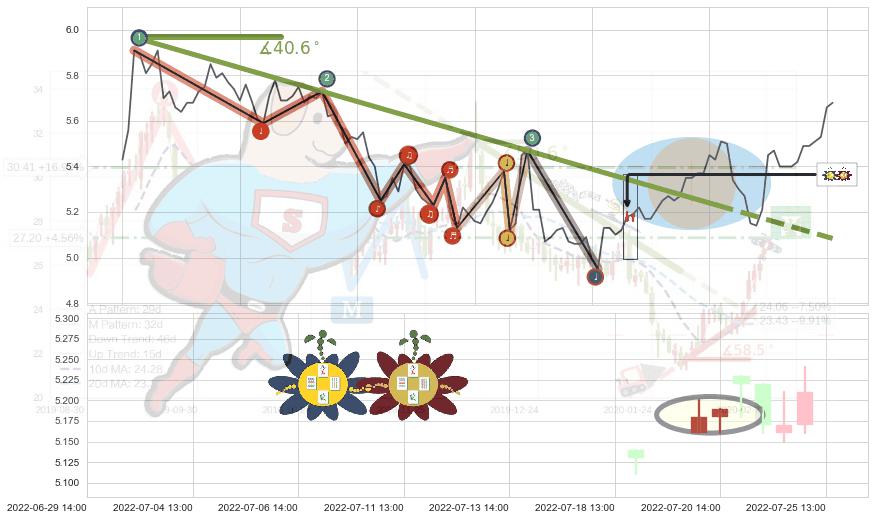 ➣ 2022-06-08 09:00-2022-07-29 14:00下跌趋势存在反转上涨[机会],其原下跌趋势的阻力位(5.08)已被突破[强支撑信号],原下跌趋势角度: 40.6˚