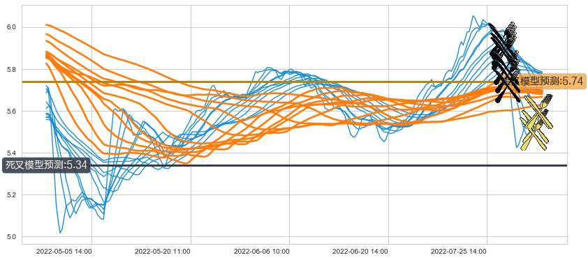 ➢ 40小时均线于(07-29 14:00: 5.89)形成【死叉】基于【死叉历史模型】预测死叉后最低波谷价格: 5.53, 死叉后最低价格5.37,已经下跌超出预测最低波谷价格, 预期反弹