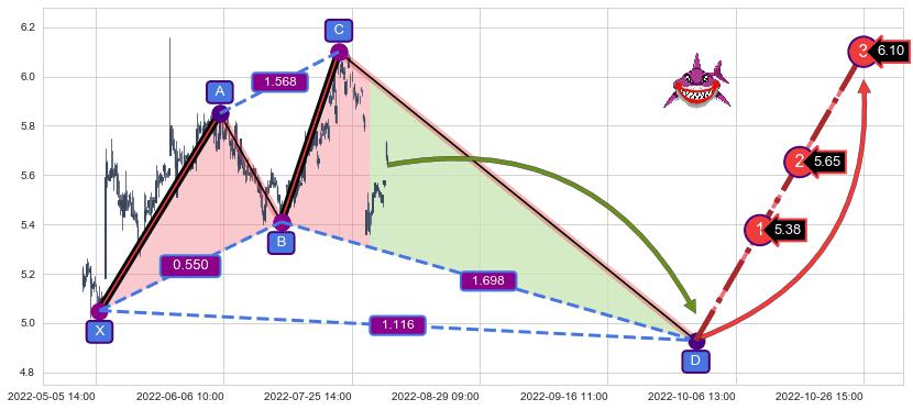 ➢ 距离预测D点位置有足够的下跌空间, 与看涨【鲨鱼】形态相反,实际方向【看跌】