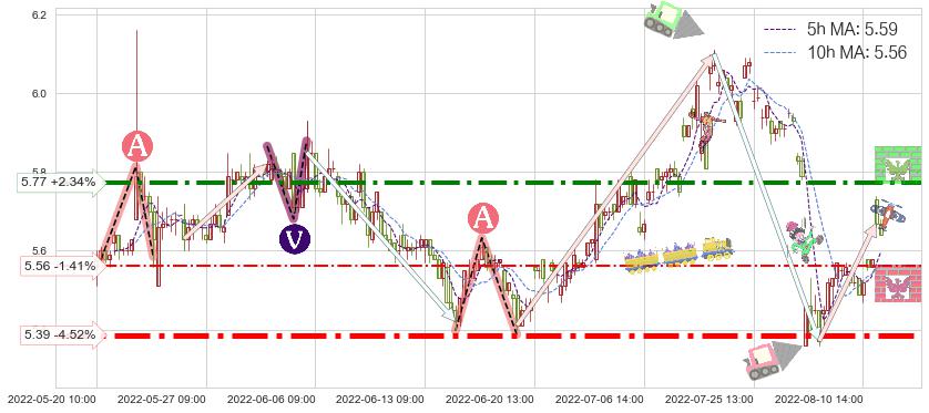 ♘ 阻力价格位5.77,可信任强度73.57%,距离最后交易2022-08-12 14:00形成的收盘价格5.64相差 +2.34%