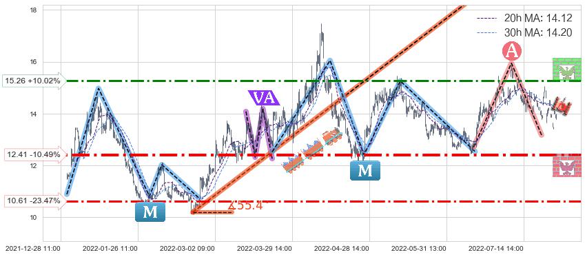 ♞ 20小时均线:14.12,30小时均线:14.20→ 快线<慢线