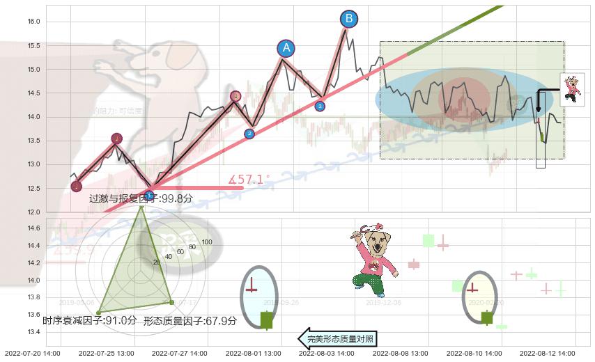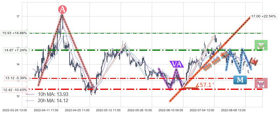 ♘ 阻力价格位14.87,可信任强度75.94%,距离最后交易2022-08-12 14:00形成的收盘价格13.87相差 +7.24%