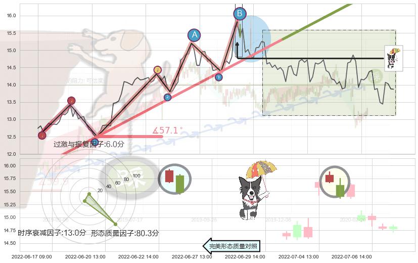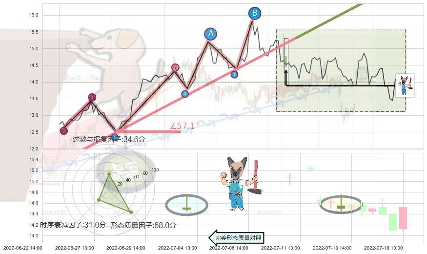 从2022-06-06 09:00至2022-07-15 13:00,共包含90个小时,阶段股价上涨14.10%,阶段股价变动位移路程比: 1 : 6,上涨趋势角度: 57.1