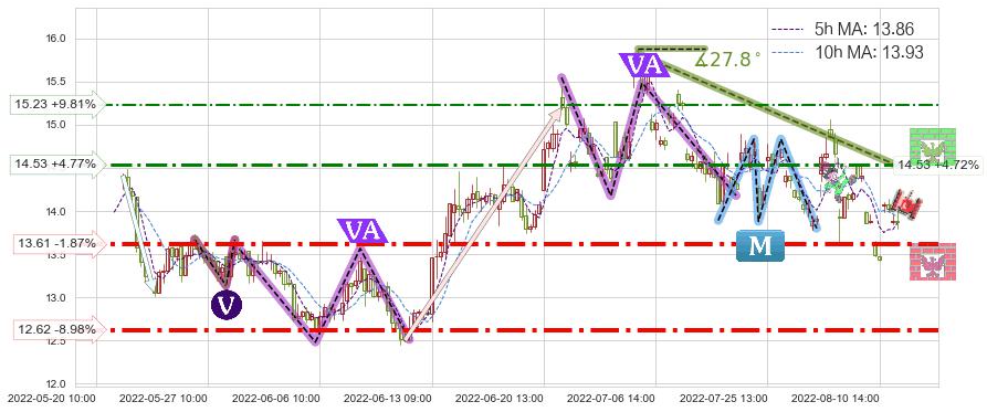 ♘ 阻力价格位15.23,可信任强度53.82%,距离最后交易2022-08-12 14:00形成的收盘价格13.87相差 +9.81%