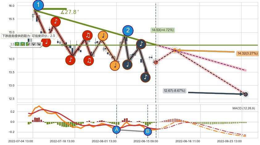 ➢ 预测:2022-08-16 11:00,【小幅反弹】稳定目前下跌趋势的前提下,预测价格:14.32
