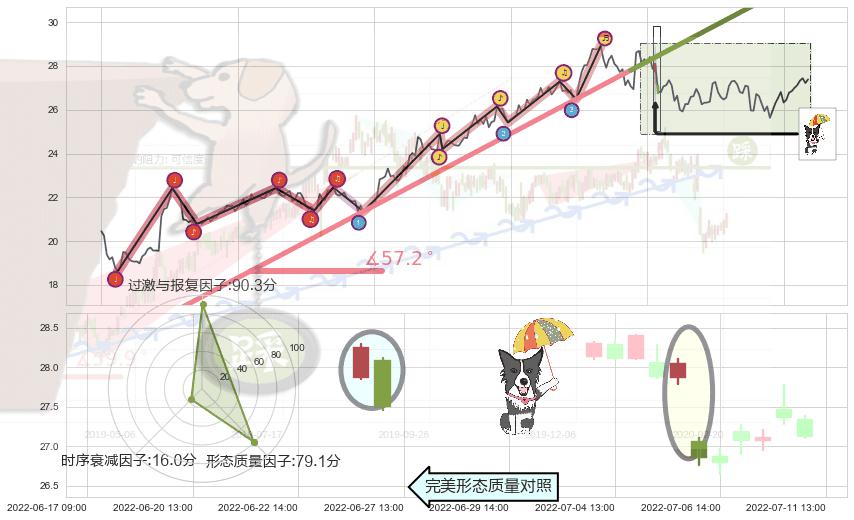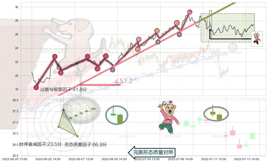 从2022-05-25 10:00至2022-06-29 13:00,共包含99个小时,阶段股价上涨24.53%,阶段股价变动位移路程比: 1 : 3,上涨趋势角度: 53.0