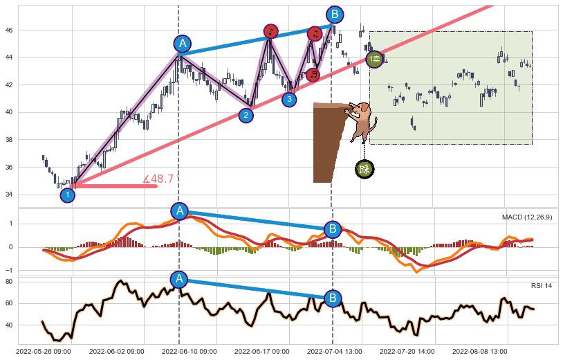 ➢ 最后的上涨趋势2022-05-26 09:00至2022-06-30 14:00:存在破位迹象,后续小调整或者反转下跌
