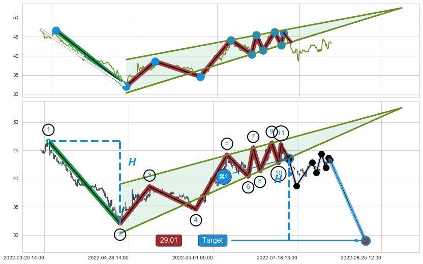➢ 最小中继整理跌幅→𝐇: 14.61 (𝐇楔型旗杆的长度:楔型起点→顶点)