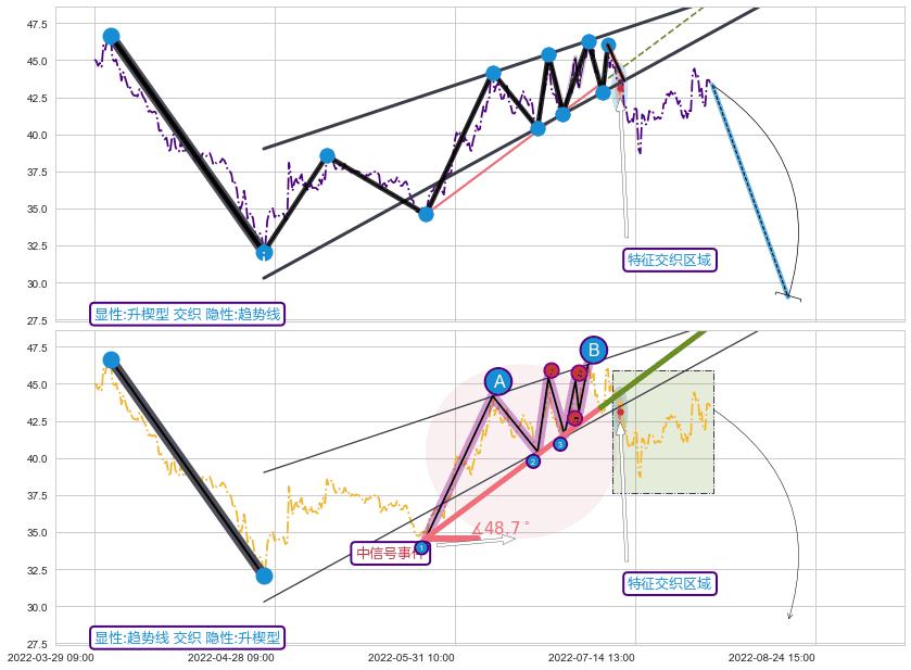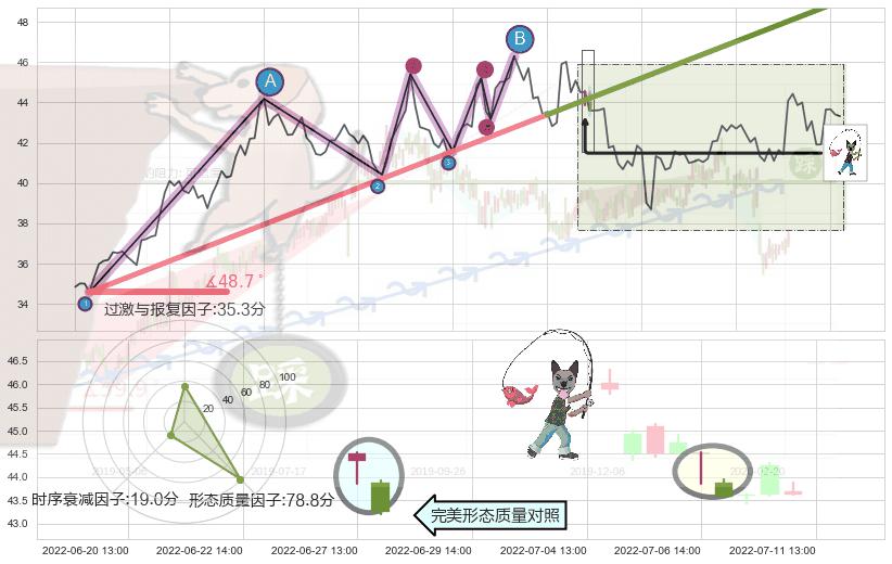 从2022-05-26 09:00至2022-06-30 14:00,共包含98个小时,阶段股价上涨24.29%,阶段股价变动位移路程比: 1 : 5,上涨趋势角度: 48.7