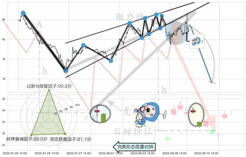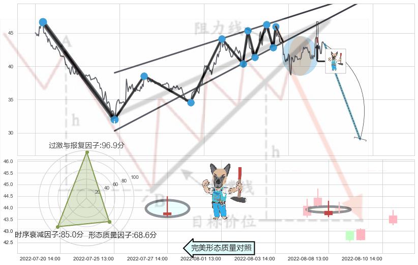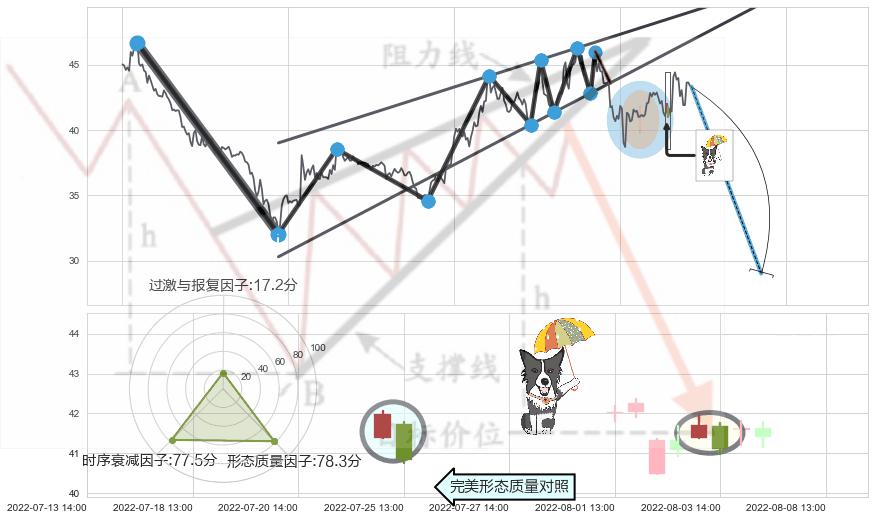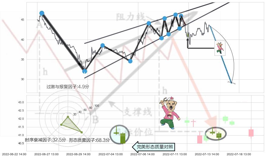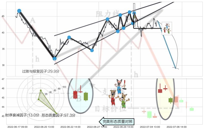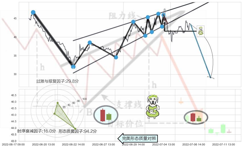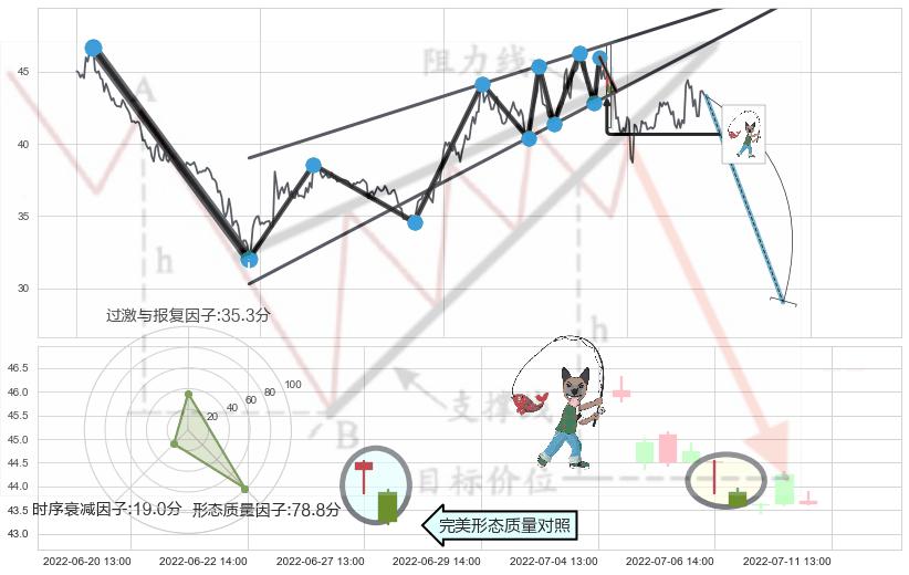 ➢ 下跌身怀六甲 🔜 升楔型支撑破位转换阻力下跌 综合量化分数:43.94 【偏空】