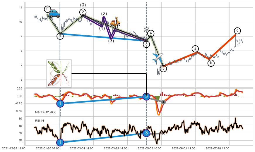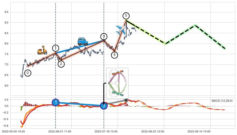 ➣ 波浪理论:猜想达到c点后小反弹终止反转下跌 → 下跌 → 【拐点】临近 → 阶段均值回复结束后继续大周期趋势跟踪