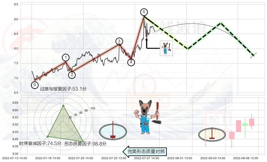 ➢ 🕰 价格走势在2022-08-01 13:00:00至2022-08-01 14:00:00期间形成中流砥柱形态,残存影响值:7.09