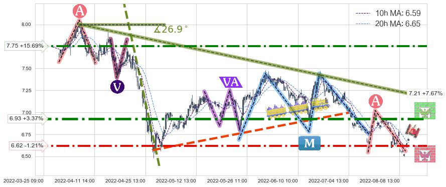 ♘ 阻力价格位6.93,可信任强度85.48%,距离最后交易2022-08-12 14:00形成的收盘价格6.70相差 +3.37%