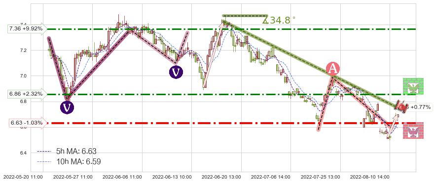 ♘ 阻力价格位7.36,可信任强度63.23%,距离最后交易2022-08-12 14:00形成的收盘价格6.70相差 +9.92%