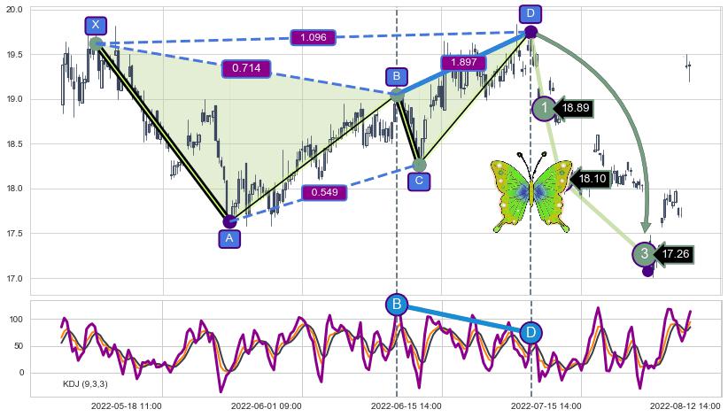 ➣ 已完成【蝴蝶】形态起点X: 05-11:13, 终点D: 07-04:14, 共157交易小时