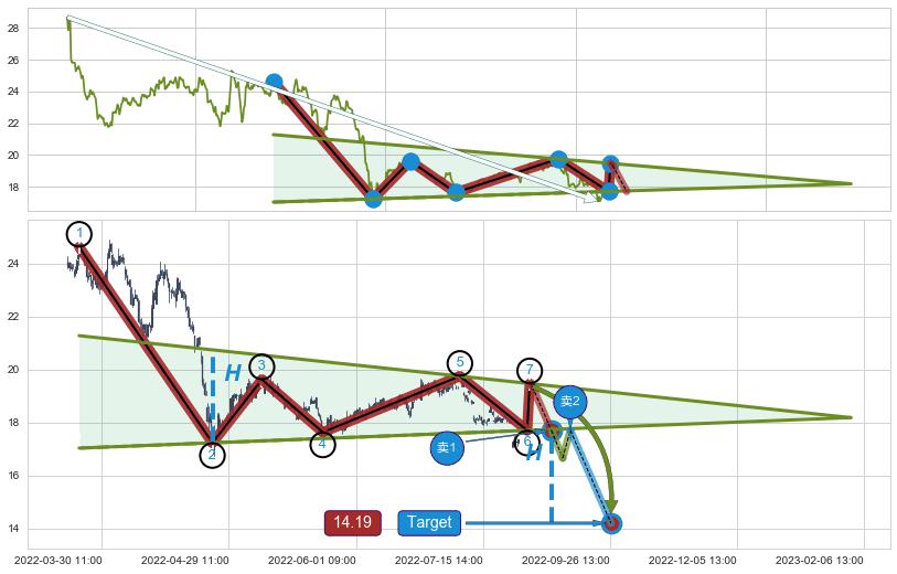 ➣ 下降对称三角整理:猜想临近关键支撑位突破点 → 临近拐点下跌 → 风险信号 → 大趋势均值回复