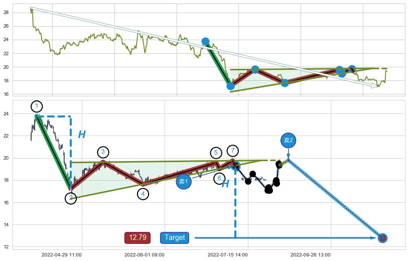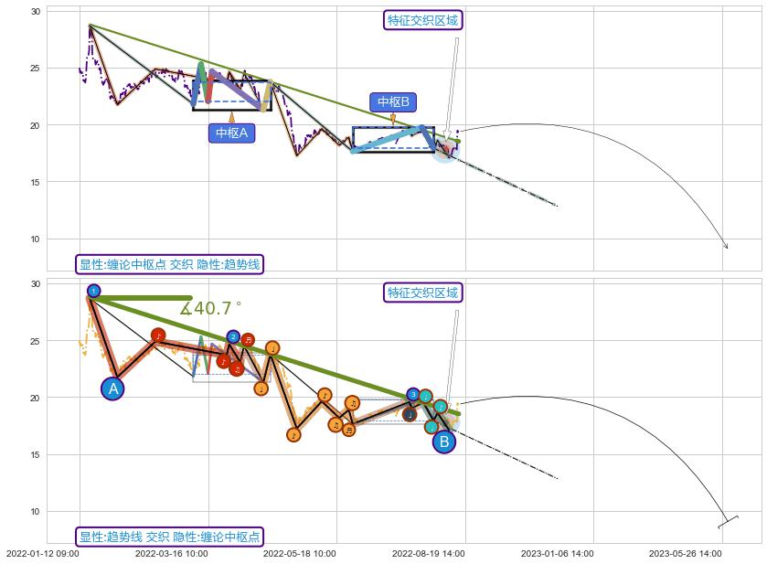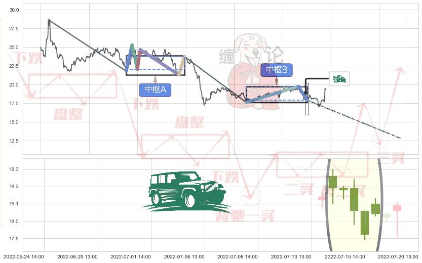 ➣ 缠论中枢点:猜想破位中枢B后持续下拉 → 下跌 → 破位中枢B支撑 → 持续趋势跟踪
