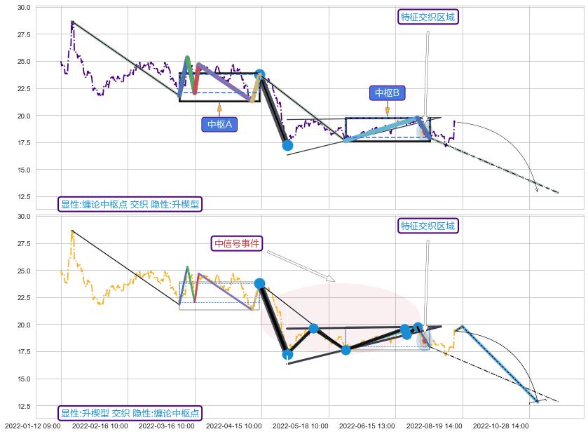 从2021-12-28 11:00至2022-01-28 09:00,共包含109个小时,阶段股价下跌-8.45%,阶段股价变动位移路程比: 1 : 13