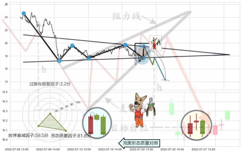 ➢ 下跌镊子线(n形磁铁) 🔜 下降对称三角整理临近支撑猜想转换阻力下跌 综合量化分数:47.64 【中性】