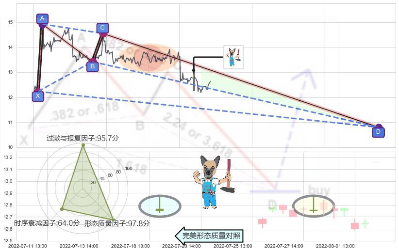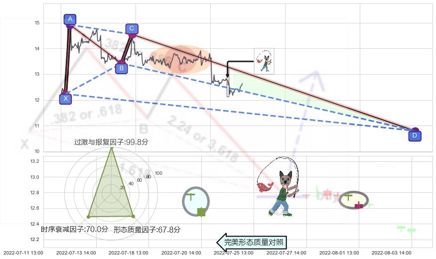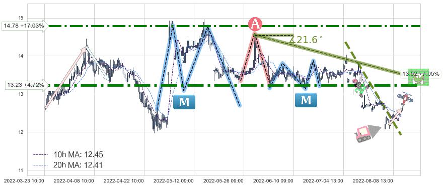 从2022-05-30 10:00至2022-08-12 13:00,共包含148个小时,阶段股价下跌-13.69%,阶段股价变动位移路程比: 1 : 7,下跌趋势角度: 21.6,2022-07-15 13:00向↘︎形成缺口,跳空下跌-7.18%˚