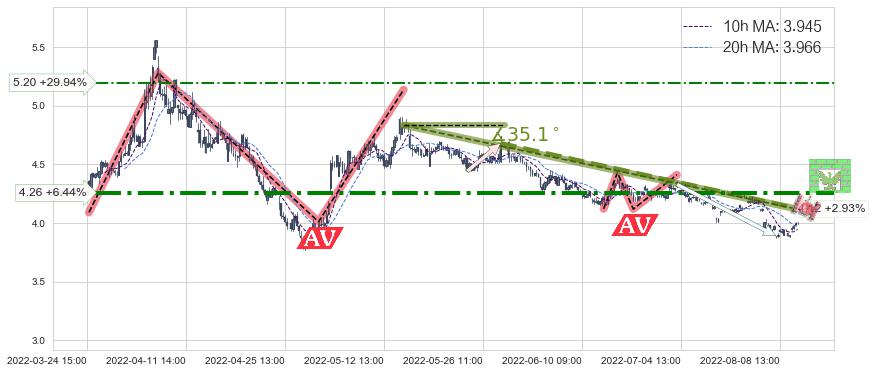 ♘ 阻力价格位4.26,可信任强度81.51%,距离最后交易2022-08-12 14:00形成的收盘价格4.00相差 +6.44%