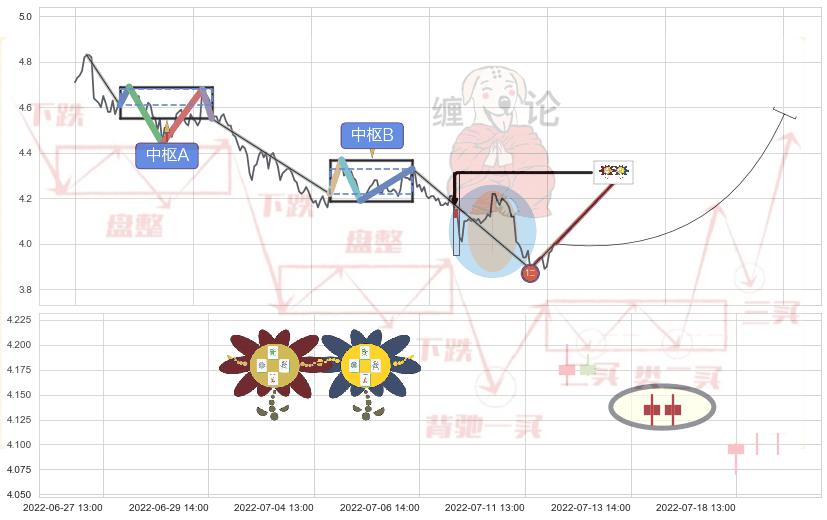 ➣ 【中枢B】:06-14:13-07-01:13,中枢由4笔构成,共36交易小时, ZG=4.33, ZD=4.22