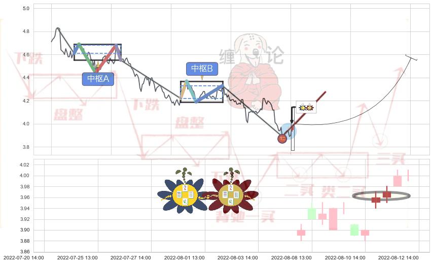 ➣ 低点影线(08-09:13: 3.900 )→回踩→第二根k线低点(08-08:13: 3.920 )