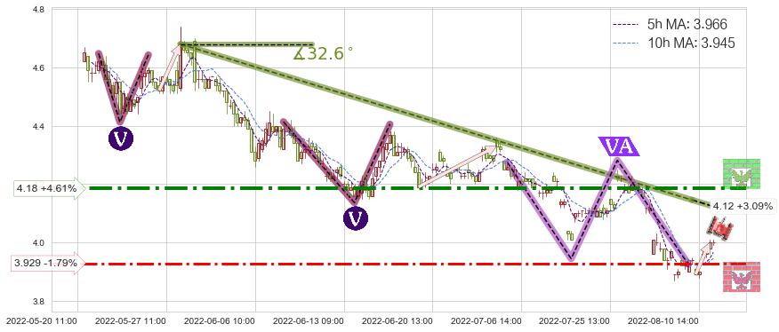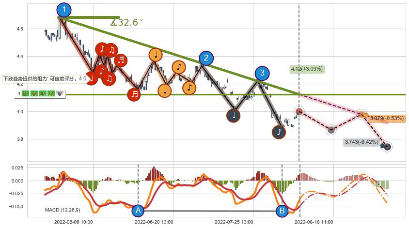➣ 预测:2022-08-23 11:00,【试探阻力】稳定目前下跌趋势的前提下,预测价格:3.979