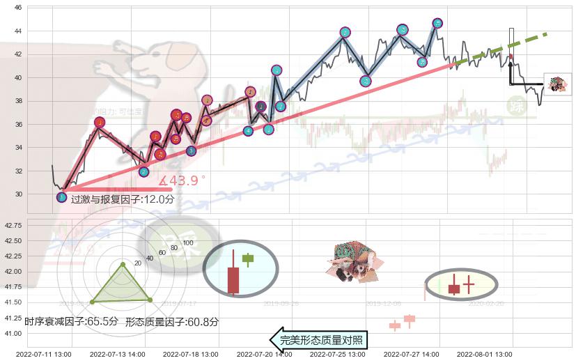 ➣ 2022-04-12 11:00-2022-07-04 14:00上升趋势存在反转[风险],其原上升趋势的支撑位(43.73)已破位[强阻力信号],原上升趋势角度: 43.9˚