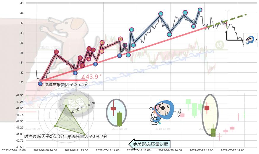 ➢ 2022-04-12 11:00-2022-07-04 14:00上升趋势存在反转[风险],其原上升趋势的支撑位(43.73)已破位[强阻力信号],原上升趋势角度: 43.9˚