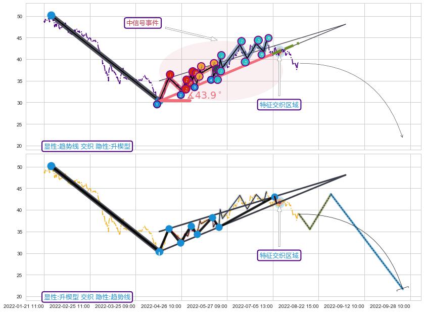 ✂️ 2022-04-12 11:00-2022-07-04 14:00上升趋势存在反转[风险],其原上升趋势的支撑位(43.73)已破位[强阻力信号],原上升趋势角度: 43.9˚