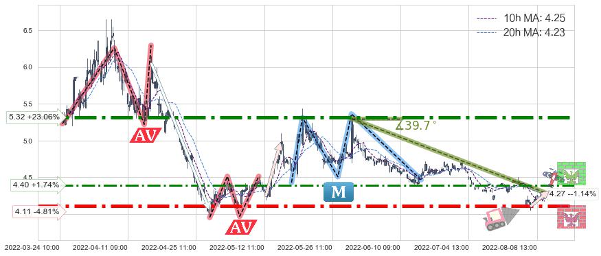 ♘ 阻力价格位4.40,可信任强度56.67%,距离最后交易2022-08-12 14:00形成的收盘价格4.32相差 +1.74%